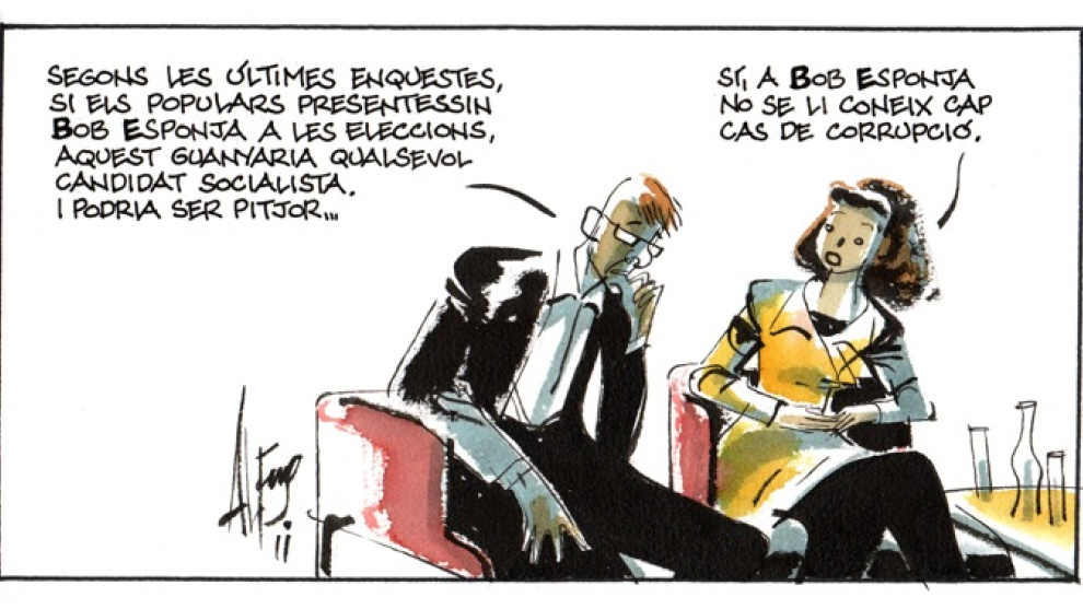 -Según las últimas encuestas, si los populares presentaran a Bob Esponja a las elecciones, éste ganaría a cualquier candidato socialista. Y podría ser peor... -Sí, a Bob Esponja no se le conoce ningún caso de corrupción.
