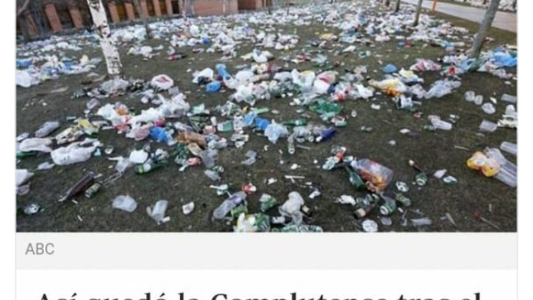 Ha sido este 10 de junio cuando en ese periódico han optado por reaprovechar su imagen de León de hace cuatro años, pero para detallar las consecuencias de un reciente macrobotellón en una de las zonas universitarias de Madrid. Aunque poco después han reculado cambiando la foto, que algunos ya habían reconocido como antigua o falsa. Pero el título y el subtítulo de la noticia siguen siendo los mismos: "Así quedó la Complutense tras el macrobotellón organizado para celebrar el fin de la Ebau", "Miles de estudiantes dejaron alfombrado de basura el campus y zonas aledañas, dando muestra de su incivismo".
