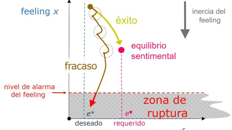 Es decir, el análisis sugiere que las parejas tienen que afrontar un gap o brecha de esfuerzo: independientemente de cuál sea nivel su esfuerzo preferido, el nivel requerido para conseguir una relación de éxito es superior. Además, resulta que la dinámica de esfuerzo no es resiliente, de modo que cuando se relaja el esfuerzo requerido –debido al gap de esfuerzo– la inercia es a relajarlo más, hasta niveles que no consiguen que la relación sea viable con el tiempo.