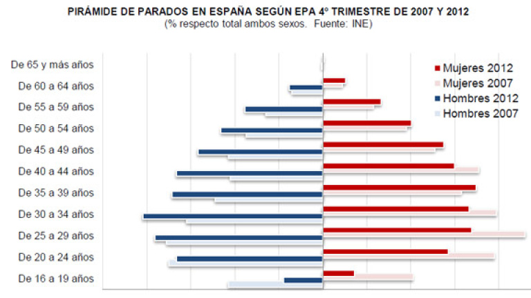 En cuanto a la estructura por edades de las y los parados, durante el mismo período comprendido entre los últimos trimestres de 2007 y 2012, el desempleo triplicó su impacto relativo en el colectivo de activos menores de 35 años (de 11,4% a 35,8%), pero también lo hizo en las cohortes de 35 a 49 años (de 6,9% a 22,6%) y de 50 a 64 años (de 6,3% a 19,4% de Tasa de Paro). Resaltar que, en el 4º trimestre de 2012, las y los jóvenes representan el 44,8% del total de parados de ambos sexos, las y los adultos (35 a 49 años) el 37,6% y las y los maduros (50 a 64 años) el 17,4% de ese total, mientras en el último trimestre de 2007 simbolizaban, respectivamente, el 53,6%, 31,9% y 14,4% del total. Por consiguiente, en el actual escenario español de desempleo de masas, la pirámide demográfica de las y los parados se ha estrechado claramente en la base, mientras se ensancha en su parte central y también en la cumbre, expresándonos que no nos encontramos solamente ante un problema de paro y empleabilidad juvenil, sino también de personas adultas y maduras, lo que agrava la situación socio-económica entre las clases medias y obreras afectadas, ya que en las cohortes de adultos y maduros se concentran quienes desempeñan el papel de sustentadores principales de hogares con hijos menores de 35 años no emancipados. Y si atendemos a la estructura por sexo, observamos una visible tendencia a la masculinización del colectivo de desempleados, ya que la Tasa de Masculinidad aumenó de 83,9 a 113,7 hombres por cada 100 mujeres, como consecuencia de la fuerte destrucción de empleos en la construcción y subsectores económicos relacionados, los cuales presentan una estructura ocupacional masculinizada.
