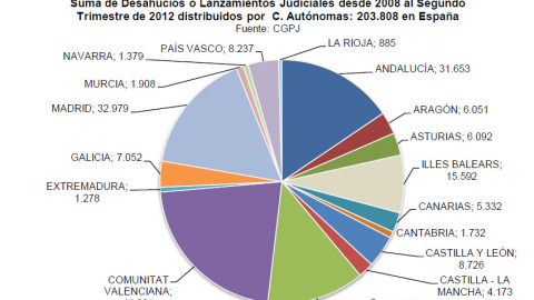 Según los datos estadísticos que publica el Consejo General del Poder Judicial, en el segundo trimestre de 2012 se realizaron 18.668 lanzamientos judiciales o desahucios en España, representando un incremento del 13,4% si nos referimos al mismo momento de 2011 (16.464) y del 124,5% con respecto al trimestre parejo de 2008 (8.316). Si sumamos todos los lanzamientos judiciales efectuados entre 2008 y la primera mitad de 2012, observamos que en el conjunto del Estado se consumaron 203.808 desahucios, un promedio diario de 124 lanzamientos judiciales durante los 1.642 días trascurridos en esos cuatro años y medio. Señalar que los desahucios de viviendas principales suelen precipitar a la mayoría de las personas afectadas a un proceso de ‘desclasamiento social’, cuando no a la pobreza severa, que también puede arrastrar al hogar del familiar y/o amigo que avaló la deuda impagada objeto de denuncia, constituyendo un rasgo alarmante del escenario de crisis social que se expande sin freno por nuestra sociedad desde 2008. Advertir que el término judicial empleado para el cumplimiento de un desahucio, 'lanzamiento', parece que nos avisa sobre el proceso de desclasamiento social en curso: se desaloja y despoja a un hogar de su vivienda habitual para lanzar a sus miembros al mundo de 'los parias'.