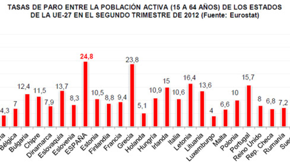Si consideramos la perspectiva de la Unión Europea, en este caso basándonos en los últimos datos publicados por Eurostat referidos al 2T de 2012, la Tasa de Paro española duplica con holgura la media de la UE-27 (10,4%), resaltando como el porcentaje más elevado, incluso por encima de Grecia (23,8%), el primer país rescatado en la Eurozona. Qué notorio contraste negativo cuando observamos Tasas bastante inferiores en Estados económicamente más desarrollados como Austria (4,3%), Holanda, Alemania, Dinamarca, Suecia, Reino Unido, Francia e Italia (10,6%); pero la comparación nos genera una incoherencia desapacible cuando divisamos inferiores Tasas de Paro en países objetivamente menos desarrollados como Rumanía (7,2%), Polonia, Bulgaria, Letonia (16,4%) o en los Estados "rescatados" de Irlanda y Portugal (15,7%).