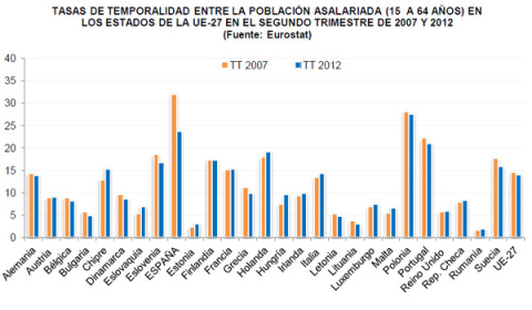 Tengamos presente que las y los desempleados de España representan la desproporción del 23,1% de todas las personas paradas en la UE-27 en el 2T de 2012, mientras en el momento análogo de 2007 su importancia se reducía al 10,7% de ese total europeo. En principio, la intensidad más elevada del desempleo en España deriva de una estructura económica que se ha basado, en mayor medida, en la construcción y especulación inmobiliaria-financiera (la llamada “economía del ladrillo”), pero también debemos considerar otros factores explicativos como el exceso de temporalidad entre la población asalariada, relación contractual que ha facilitado una rápida y mayor destrucción de puestos de trabajo al extenderse la crisis y recesión económica, bien mediante la vía de no renovar los contratos que finalizan o bien a través de la suspensión empresarial de contratos temporales, dado el menor gasto de indemnización por despido, en comparación con los contratos indefinidos. En concreto, la Tasa de Temporalidad entre la población española asalariada asciende al 24% en el 3T de 2012, mostrando una caída de ocho puntos en relación a la Tasa respectiva de 2007 (31,9%).