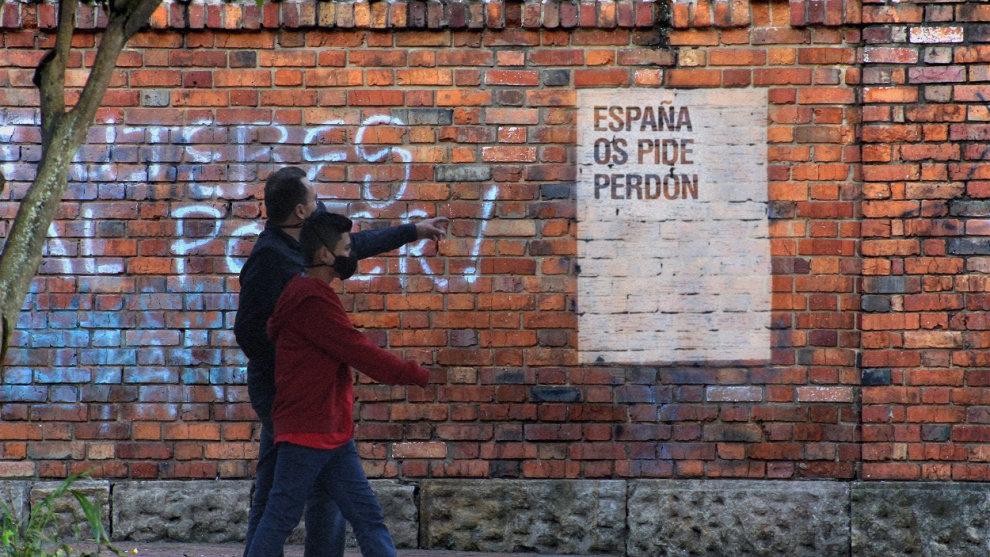 En la primera acción llevada a cabo en la ciudad de Bogotá, durante un espacio de tiempo superior a las cuatro horas, llevamos a cabo la lectura performativa de un texto de noventa y dos hojas, en la que se escuchaba de forma continua y reiterada la cita España os pide perdón. Dos meses más tarde, invitados por el Museo de la Ciudad de México, instalamos una lona con la misma oración en la fachada. El lienzo fue retirado un mes después y a continuación el presidente de México, Andrés Manuel López Obrador, realizó una rueda de prensa donde exigió públicamente el perdón de España. Otorgando al arte el poder de herramienta transformadora y útil.