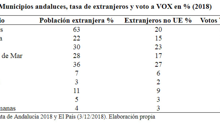 Durante años, la polarización del discurso migratorio ha tenido poca incidencia en la sociedad española, puesto que la acción de gobierno de PSOE y PP ha actuado de barrera de contención. La escasa politización del tema migratorio, el gran peso de la inmigración de América Latina y la continuidad en las políticas migratorias de PSOE y PP ha dejado poco espacio político a los partidos que han hecho bandera del discurso anti-inmigratorio. No obstante, la acción de la gran crisis financiera (2008-2015) y sus consecuencias (incremento del desempleo y de la pobreza de los hogares) ha fortalecido el discurso anti-inmigratorio y ultranacionalista de VOX y ha permitido que la extrema derecha alcance, por primera vez, cotas electorales importantes en determinados territorios españoles. En este sentido, los datos sobre las últimas elecciones andaluzas de 2018 son elocuentes. Como se puede observar en la tabla I, en los municipios con mayor población extranjera VOX tiene una proporción de voto mucho mayor (19-30%) a la obtenida en el conjunto de Andalucía (10,97%), mientras que poblaciones como Sevilla, Dos Hermanas o Carmona donde la proporción de extranjeros es baja el voto de VOX también es mucho más reducido y se asemeja a la media andaluza.