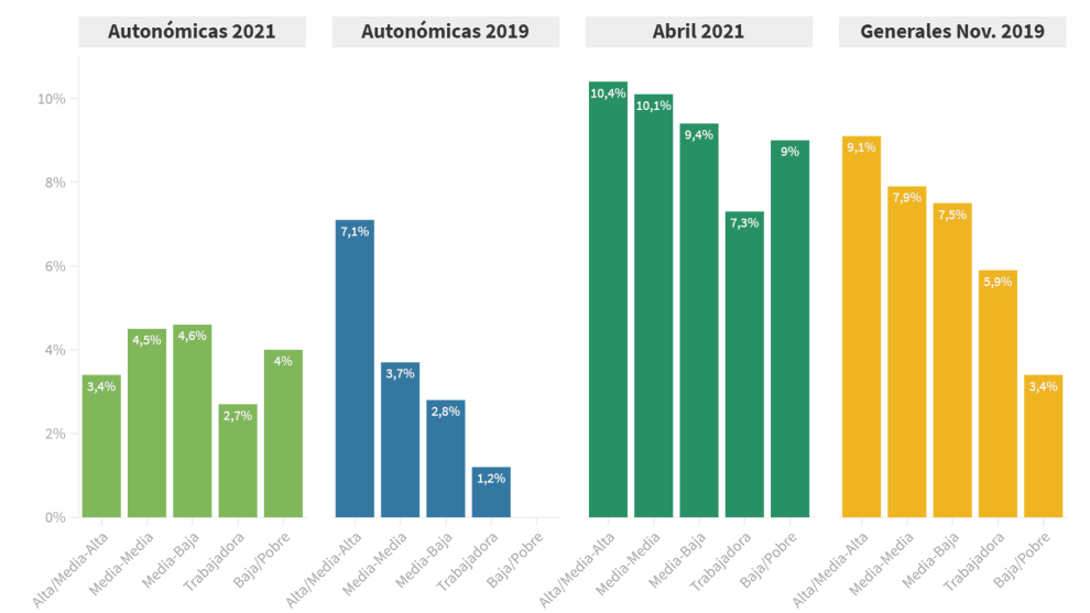 Por último, destacar la diferencia en el porcentaje de voto que obtuvo Vox en las elecciones autonómicas y generales de 2019 en Puente de Vallecas y en el barrio de Salamanca. Estos son los segundos distritos, respectivamente, en menor y mayor renta. La diferencia de voto entre ambos superó los ocho puntos en los comicios nacionales —20,36% en el distrito de Salamanca frente al 12,26% obtenido en Puente de Vallecas—. En las autonómicas de mayo de 2019 la diferencia de voto a Vox entre ambos distritos fue más del doble, ya que en Puente de Vallecas solo logró el 5,35% mientras que en el de Salamanca la cifra ascendió a 11,68%.