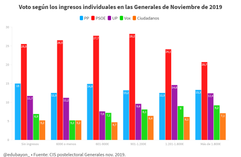 En las últimas elecciones de ámbito nacional Vox fue más votado por los electores que superaban el umbral de los 1.800 € (9,2%), que por quienes no alcanzaban los 600 €/mes (5,2%). Ambos grupos de renta suponen los segmentos en los que Vox obtuvo, respectivamente, mejor y peor resultado.