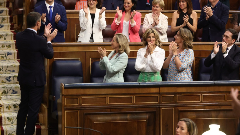 La bancada socialista aplaude al presidente del Gobierno, Pedro Sánchez, tras su intervención en la primera jornada del Debate sobre el Estado de la Nación, en el Congreso de los Diputados. E.P./Eduardo Parra