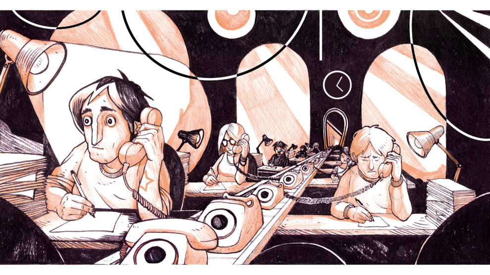 En el tablón se encuentra la información relativa a convenios y a sindicatos. Estos últimos no tienen mucho éxito en La Subcontrata, principalmente porque aquí se hablan decenas de idiomas y la mayor parte del personal habla castellano con dificultades o no lo habla en absoluto. Además, todo el mundo está de paso y los trabajadores no se quedan el tiempo suficiente en la empresa o en el país como para considerar implicarse. De hecho, según datos aportados el profesor Godino (Godino, 2017) sólo el 10,90% de los teleoperadores se afilia a un sindicato. Eso sí, se nota que muchos de nosotros venimos de la rama de humanidades o artística, ya saben, profesiones con salidas: publicistas, periodistas, filólogos, cinematógrafos, pintores, músicos, diseñadores de ropa… Los gráficos de los sindicatos tienen un nivel altísimo. Por ejemplo, uno de los colectivos ha elegido este trimestre La Guerra de las galaxias como tema de campaña. Para llamar a la afiliación tienen un cartel en el que aparecen una nave imperial y el Halcón milenario con el mensaje “¿Imperio o Rebelde?”. Con el acoso sexual también son explícitos: un cartel con Chubaca tocándole un pecho a Leia. Alguien contestó enseguida pegando un post-it: “El acoso sexual no es un chiste”. Otra cosa no, pero Barcelona es una de las ciudades mundiales del marketing. Su capacidad para lanzar mensajes a multitud de niveles, desde multinacionales de publicidad hasta las calles, es impresionante. Pongamos como ejemplo la guerra iconoclasta que se vive desde el 1-O. Alguien pinta un lazo amarillo en una pared. Una segunda persona se acerca y pinta otro lazo en el medio de color rojo, resultando en los colores de la bandera rojigualda. Un tercero viene y rodea el lazo con color morado: bandera tricolor. Y, recientemente, hay un cuarto que se dedica a poner una V antes del lazo y una X después, formando las siglas de VOX. Fascinante.