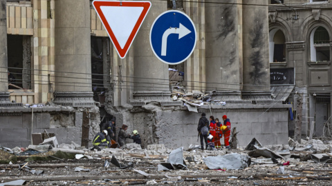 Varias personas retiran escombros de un edificio oficial en la ciudad de Járkov, ciudad en el este de Ucrania que este pasado lunes sufrió un duro ataque son misiles por parte de Rusia.