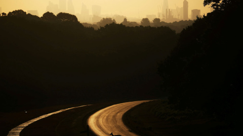 Un ciervo cruza la calle al amanecer, con el sol saliendo detrás de The Shard y el distrito financiero en Richmond Park en Londres, Gran Bretaña.