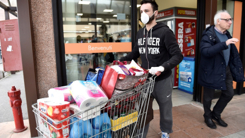 Un hombre hace acopio de enseres de primera necesidad en un supermercado italiano.