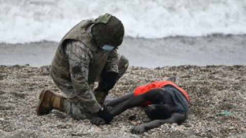 Un militar del ejército español ayuda a una persona tumbada en la orilla en una jornada marcada por las devoluciones en caliente que están efectuando a los migrantes que han entrado en Ceuta procedente de Marruecos.