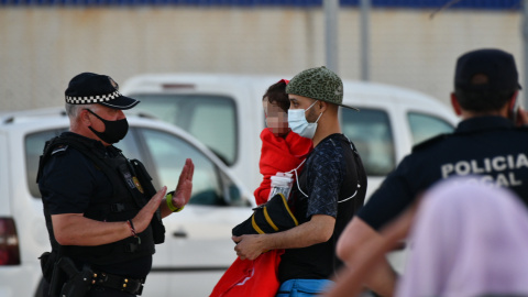 Un policía corta el paso a un hombre junto a una niña en la playa del Tarajal. Este lunes se ha batido la cifra récord de llegada de migrantes a España en un solo día por vía marítima, contabilizando los 6.000 marroquíes que según la delegación del gobierno en Ceuta han llegado a la ciudad autónoma.