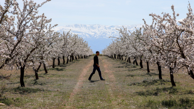 Francisco Martínez, de 43 años, es un agricultor que cultiva almendras junto a su hermano Álvaro utilizando técnicas destinadas a dar nueva vida a la tierra. En la imagen, pasea junto a los almendros en flor de su finca frente a la montaña de Sierra Nevada, en Hernán Valle, cerca de Granada.