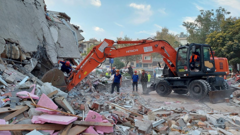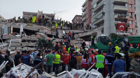 Los habitantes de turcos de la ciudad de Izmir movilizan grúas hasta las ruinas de los edificios para buscar sobrevivientes entre los escombros.