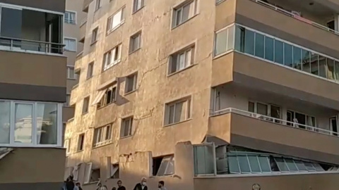 Los ciudadanos de la ciudad de Izmir, en Turquía, rodean un edificio con la parte baja totalmente devastada tras el terremoto.