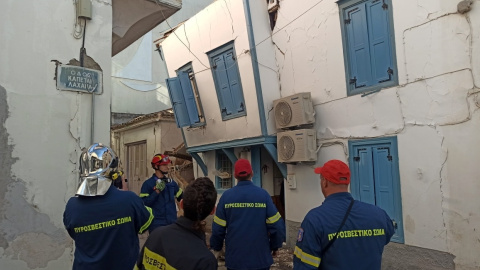 Los bomberos están junto a los edificios dañados en la ciudad portuaria de Vathy tras el terremoto que duro más de 30 segundos.