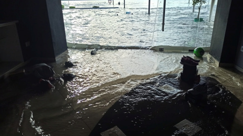 El agua de mar inunda una tienda en la ciudad portuaria de Vathy después de un terremoto, en la isla de Samos.