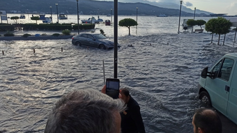 La gente se para en el paseo inundado de la ciudad portuaria de Vathy después del un terremoto, en la isla de Samos, Grecia.