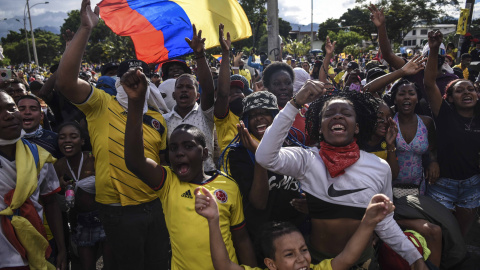 Un grupo de personas, entre ellas varios niños, baila mientras grita arengas contra el Gobierno durante el cuarto día consecutivo de Paro nacional en Colombia, en Puerto Rellena. Este barrio pobre de la ciudad colombiana de Cali ya ha pasado a denominarse Puerto Resistencia, en referencia al epicentro de las protestas contra la brutal represión ejercida por la ESMAD, el batallón antidisturbios de la Policía. La tercera ciudad del país concentra a la mayoría de heridos y asesinados durante las movilizaciones.