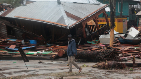 Los meteorólogos del Centro Nacional de Huracanes (NHC), con sede en Miami, advirtieron de posibles resacas y corrientes marinas que afectarán la mayoría de la costa de Centroamérica y la Península de Yucatán durante las próximas 24 horas. En la imagen, un hombre pasa frente a los escombros de una vivienda en Puerto Cabezas.