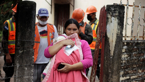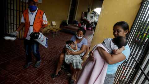 Iota tocó tierra apenas dos semanas después de que lo hiciera el huracán Eta. Este último llegó el cuatro de noviembre como depresión tropical a Honduras y causó lluvias en el istmo que dejaron al menos 144 muertos, 120 desaparecidos, además de destrucción y suelos saturados de agua. En la imagen, dos mujeres cargan a sus bebés en una escuela que se utiliza como refugio a medida que se acerca la tormenta en Choluteca, Honduras.