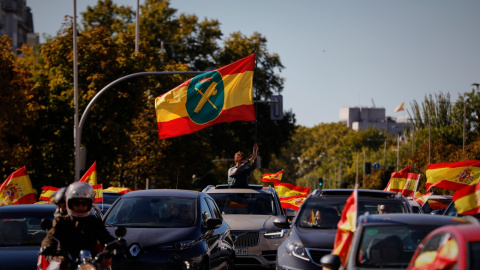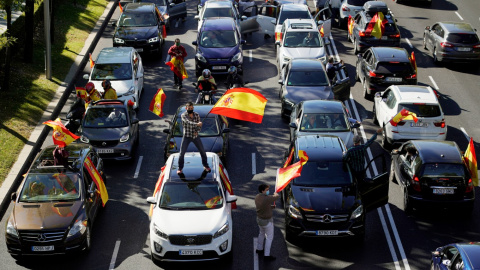 Seguidores del partido ultraderechista Vox salen de sus vehículos con banderas de España en el paseo de la Castellana de Madrid. Según el partido, la concentración es contra la "incompetencia" del Gobierno y sus medidas "totalitarias y absurdas" para hacer frente al coronavirus.