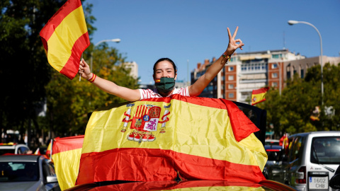 Una mujer participa en la protesta "contra el estado de alarma" organizada por el partido de extrema derecha.