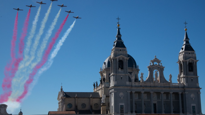 Este año la celebración del 12 de octubre ha estado marcada por la pandemia del coronavirus y las limitaciones de movilidad en la Comunidad de Madrid, con contagios récords en las últimas semanas, que han obligado a prescindir del tradicional desfile por el Paseo de la Castellana y a limitar la participación militar en el acto nacional.
