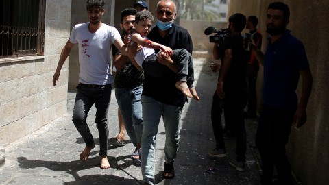 La Comisión Europea (CE) ha pedido este martes una "desescalada inmediata" de la tensión en Israel y Palestina. "Esta es la prioridad, la desescalada inmediata para proteger la vida de los civiles", dijo el portavoz de Asuntos Exteriores del Ejecutivo Comunitario, Peter Stano, que condenó también el lanzamiento de cohetes desde la Franja de Gaza a Israel. En la imagen, un niño palestino herido es evacuado tras un bombardeo de Israel.