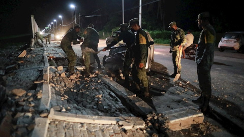 Dos coches a punto de caer a un barranco por el suelo reblandecido debido al terremoto en el balneario de Acapulco, en el estado de Guerrero (México).