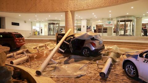 Coches dañados a la entrada de un hotel en Acapulco.