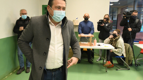 El candidato de la Unión del Pueblo Leonés (UPL) a la Presidencia de la Junta de Castilla y León, Luis Mariano Santos, durante su votación en el colegio electoral instalado en la guardería municipal de Cistierna (León) este domingo, durante la jornada de elecciones autonómicas en Castilla y León.
