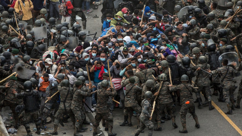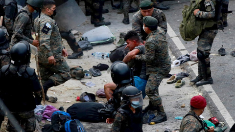 Soldados guatemaltecos arrastran a un hombre en Chiquimula (Guatemala). Los migrantes fueron atacados a palos y con bombas lacrimógenas por miembros del Ejército de Guatemala.