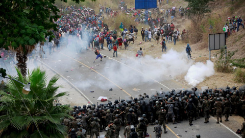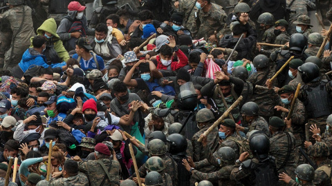 Miles de migrantes hondureños que intentaban llegar a EEUU cruzando México han sido bloqueados por la fuerza en la frontera guatemalteca.