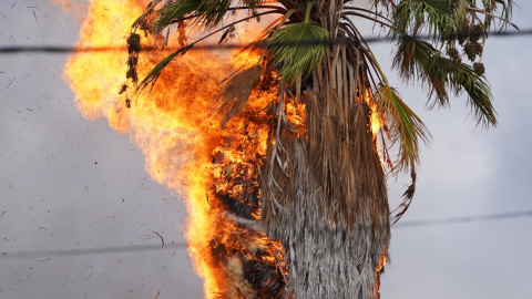 Una palmera se incendia tras la entrada en erupción del volcán en la zona de Cabeza de Vaca, en El Paso, La Palma.