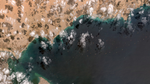 Esta imagen satelital muestra el buque portacontenedores Ever Given en el canal de Suez antes de ser desencallado por los remolcadores.