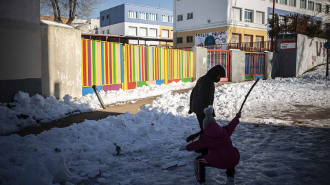 Dos niños juegan junto a uno de los accesos totalmente congelados del Colegio Perú, en el barrio de Carabanchel, Madrid, este miércoles.