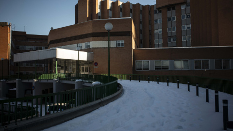 El acceso norte del Hospital 12 de Octubre de Madrid, totalmente cubierto de nieve este miércoles, cinco días después de la llegada de Filomena, impidiendo la llegada de ambulancias por esta puerta.