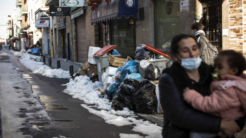 Un mujer carga con un bebé por una calle helada y con basura amontonada en el barrio de Usera, Madrid, este miércoles, cinco días después del paso de Filomena.