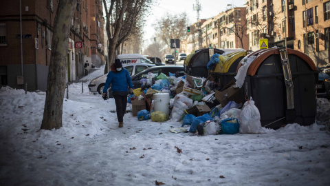La basura se acumula junto a los contenedores a rebosar en el distrito de Carabanchel, donde la recogida de residuos lleva cinco días sin pasar por el mal estado de las calles a consecuencia del temporal Filomena.