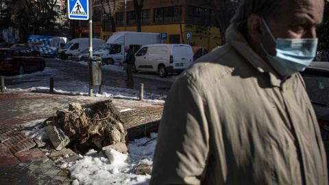 Un hombre pasa junto a un árbol arrancado de raíz por la nevada, que ha levantado parte de la acera en el barrio de Comillas, Madrid, este miércoles.