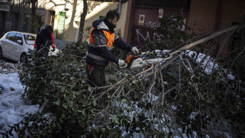 Un trabajador subcontratado de urgencia por el Ayuntamiento de Madrid corta las ramas de un árbol caído tras el paso de Filomena por el distrito de Usera, Madrid, este miércoles.