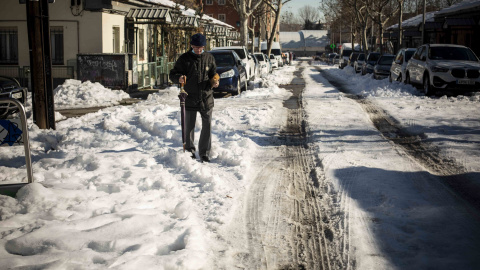 Un anciano trata de cruzar la calle en el barrio de Comillas, Carabanchel. Cinco días después de la gran nevada, la nieve se ha convertido en hielo, dificultando la movilidad en gran parte de la zona.