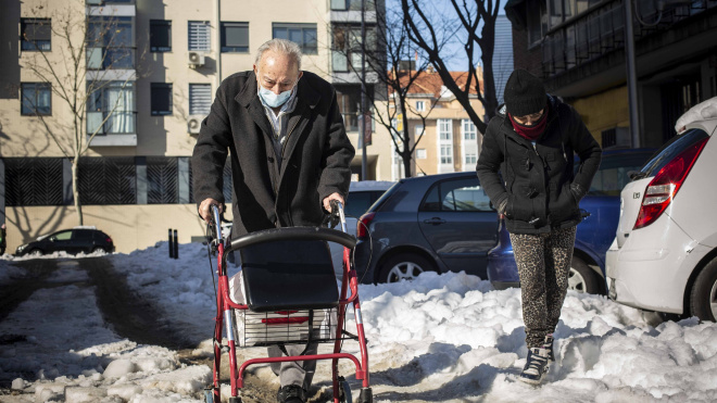 Un anciano intenta volver a casa después de comprar el pan en el barrio de Usera, Madrid, este miércoles. Gran parte de las aceras y calles de la periferia siguen impracticables cinco días después del temporal.