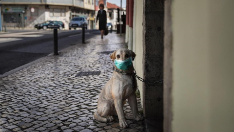 Un perro de porcelana al que han ataviado con una mascarilla, en un restaurante de Amadora, en Portugal.