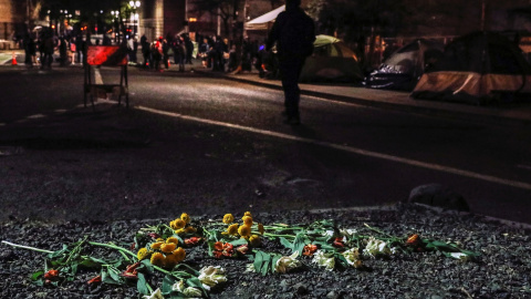 Un puñado de flores reposan en el suelo mientras la gente se reúne en las calles cercanas al Centro de Justicia, tras el veredicto en el juicio del expolicía.