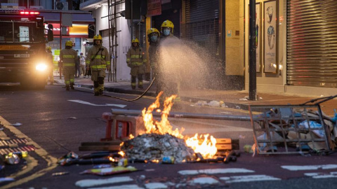 Varios Bomberos hongkoneses apagando el fuego de las barricadas