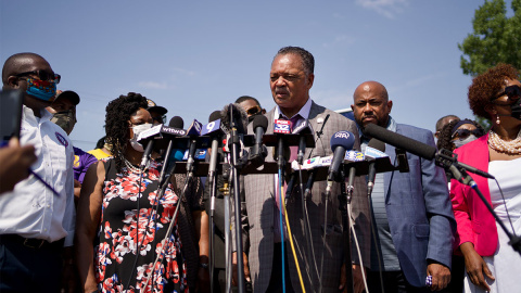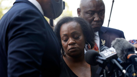 Julia Jackson , madre de Jacob Blake, Jr., en una rueda de prensa junto al abogado de derechos civiles Ben Crump (a la derecha), en la puerta del Tribunal del Condado en Kenosha, Wisconsin.